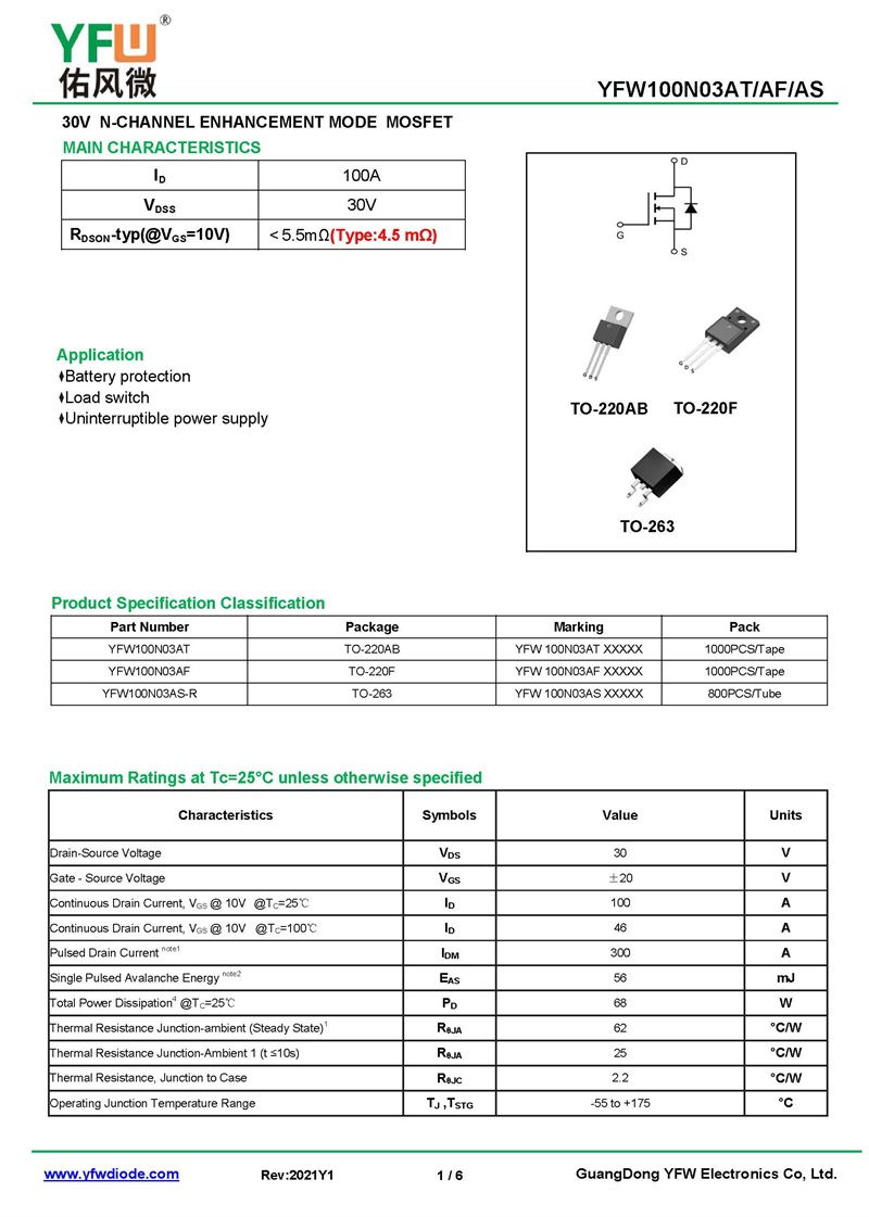 場效應管YFW100N03AS-R 規格書_價格_PDF手冊-廣東佑風微原廠YFW100N03AS-R TO-263_(YFW佑風微)品牌