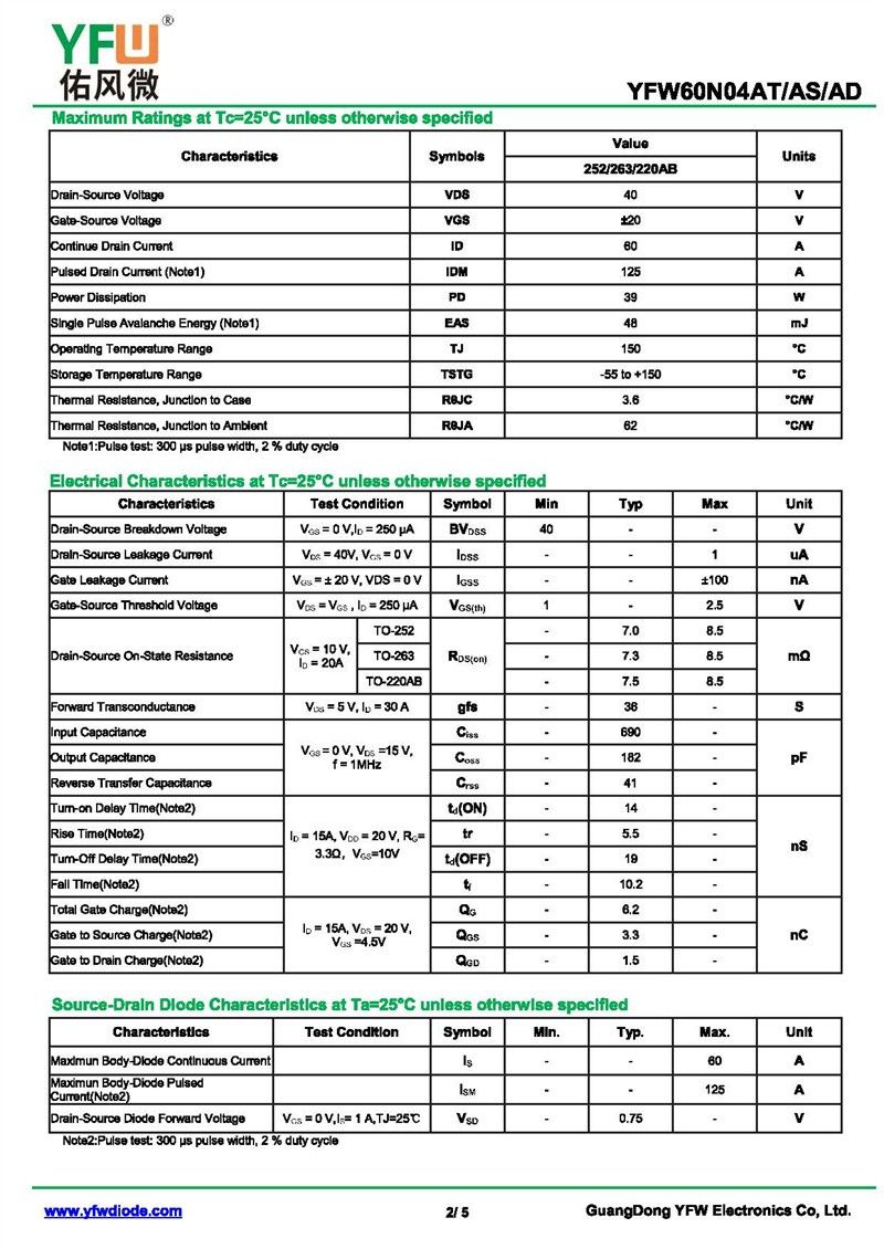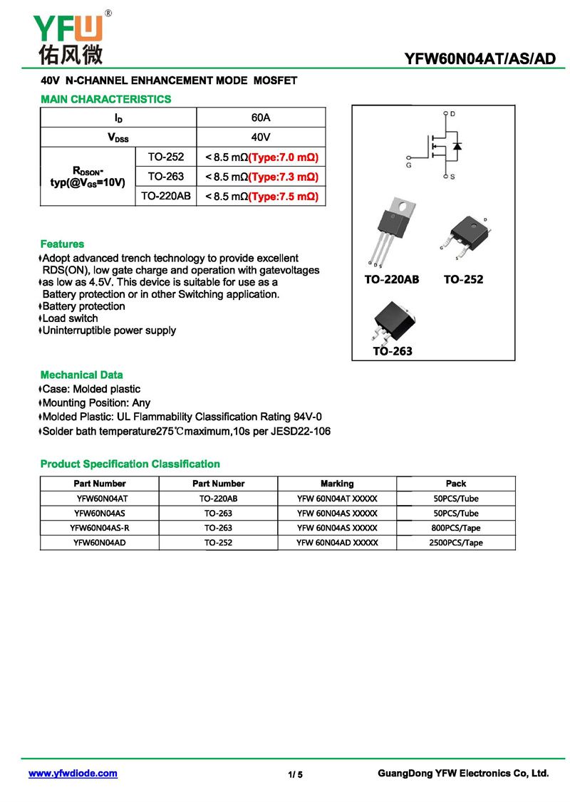 場效應管YFW60N04AS-R 規格書_價格_PDF手冊-廣東佑風微原廠YFW60N04AS-R TO-263_(YFW佑風微)品牌