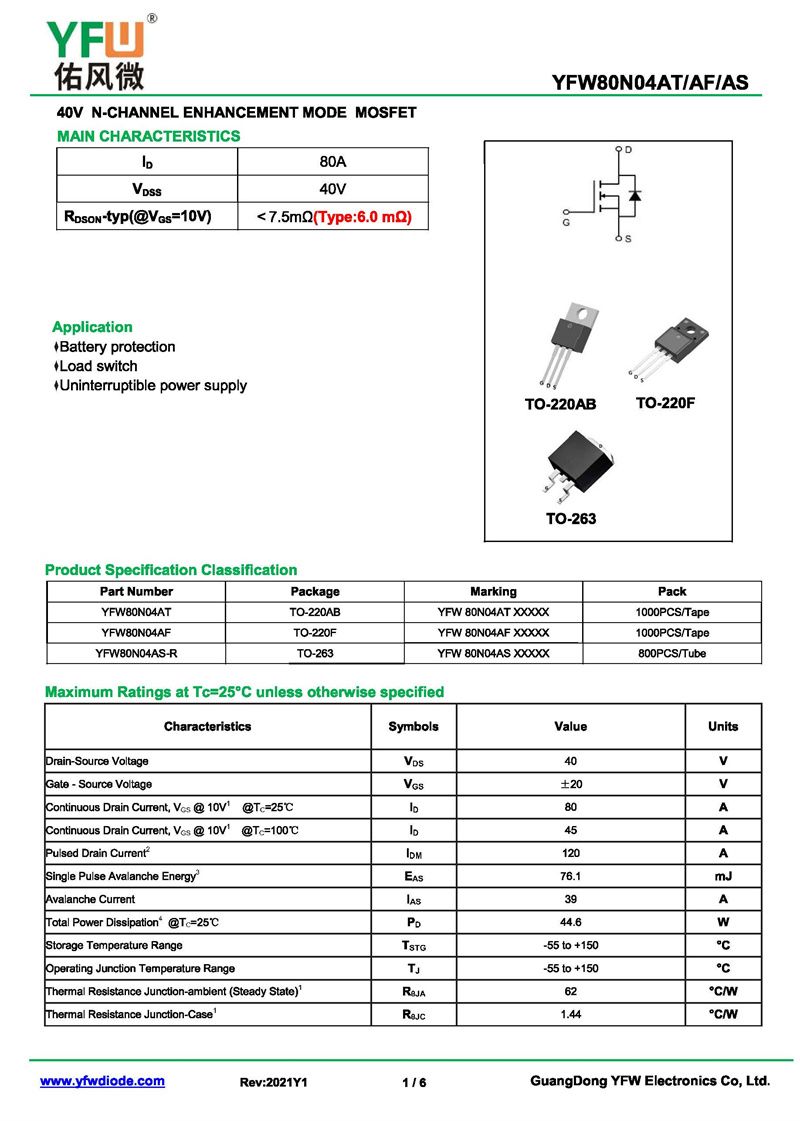 場效應管YFW80N04AS-R 規格書_價格_PDF手冊-廣東佑風微原廠YFW80N04AS-R TO-263_(YFW佑風微)品牌
