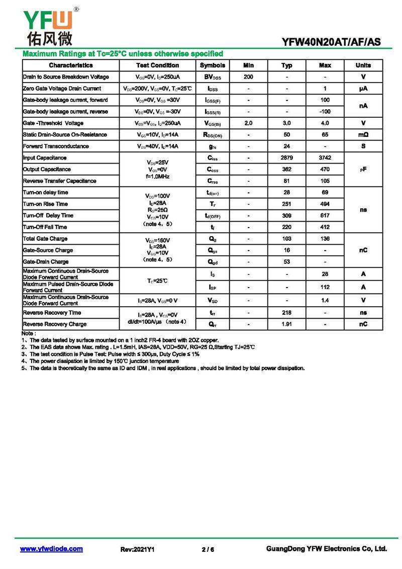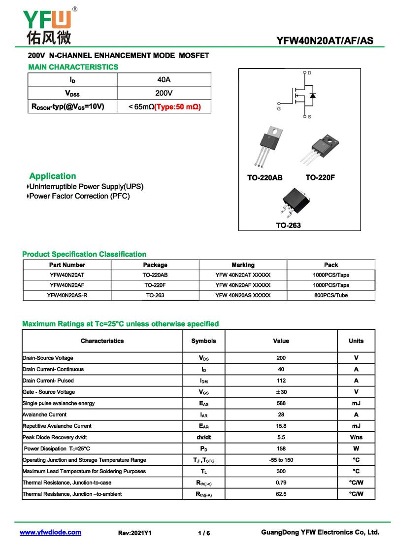 場效應管YFW40N20AS-R 規格書_價格_PDF手冊-廣東佑風微原廠YFW40N20AS-R TO-263_(YFW佑風微)品牌