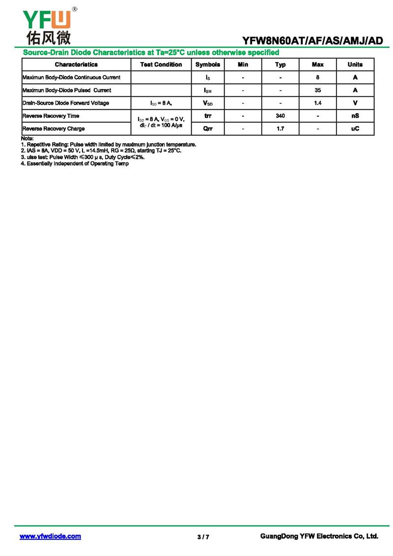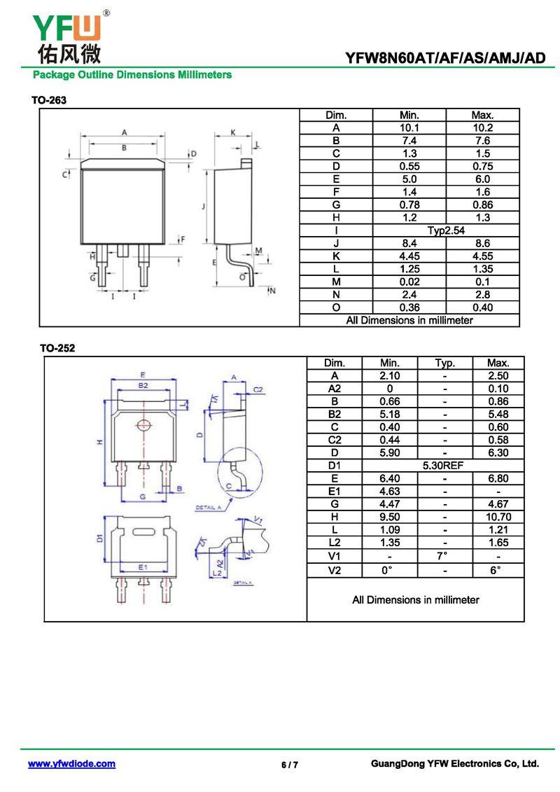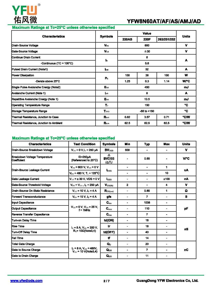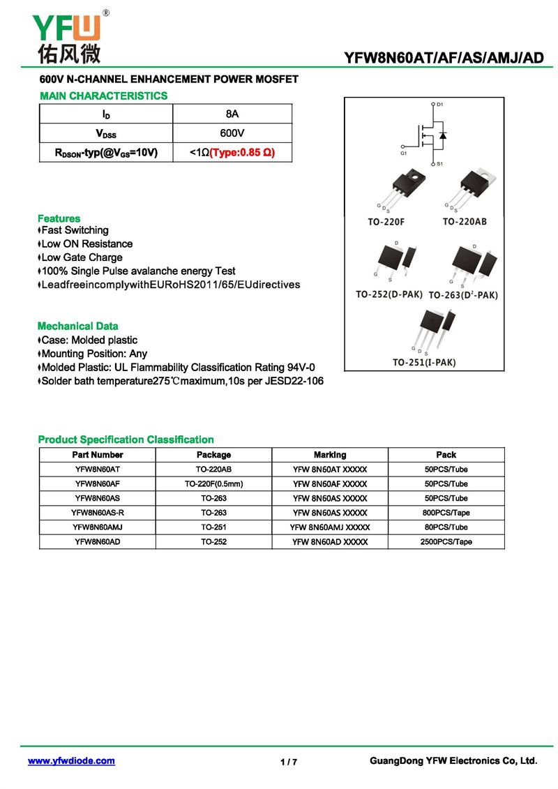 場效應管YFW8N60AS-R 規格書_價格_PDF手冊-廣東佑風微原廠YFW8N60AS-R TO-263_(YFW佑風微)品牌
