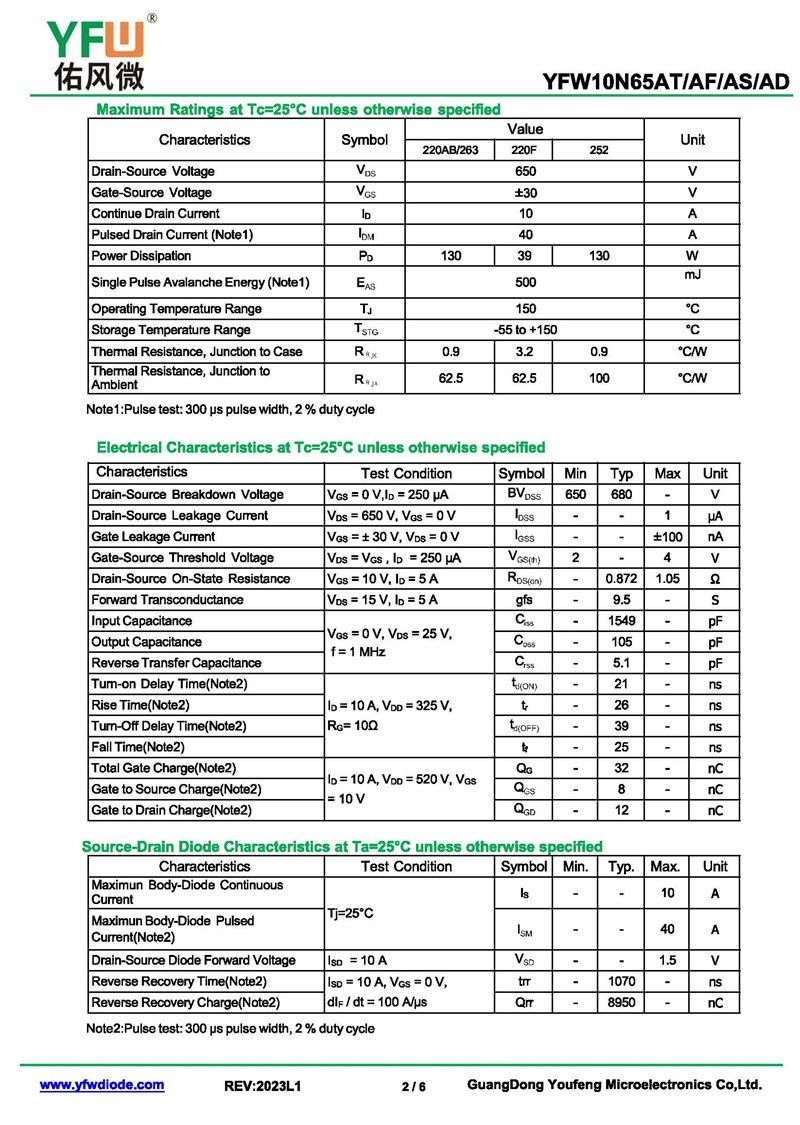 場效應管YFW10N65AS-R 規格書_價格_PDF手冊-廣東佑風微原廠YFW10N65AS-R TO-263_(YFW佑風微)品牌