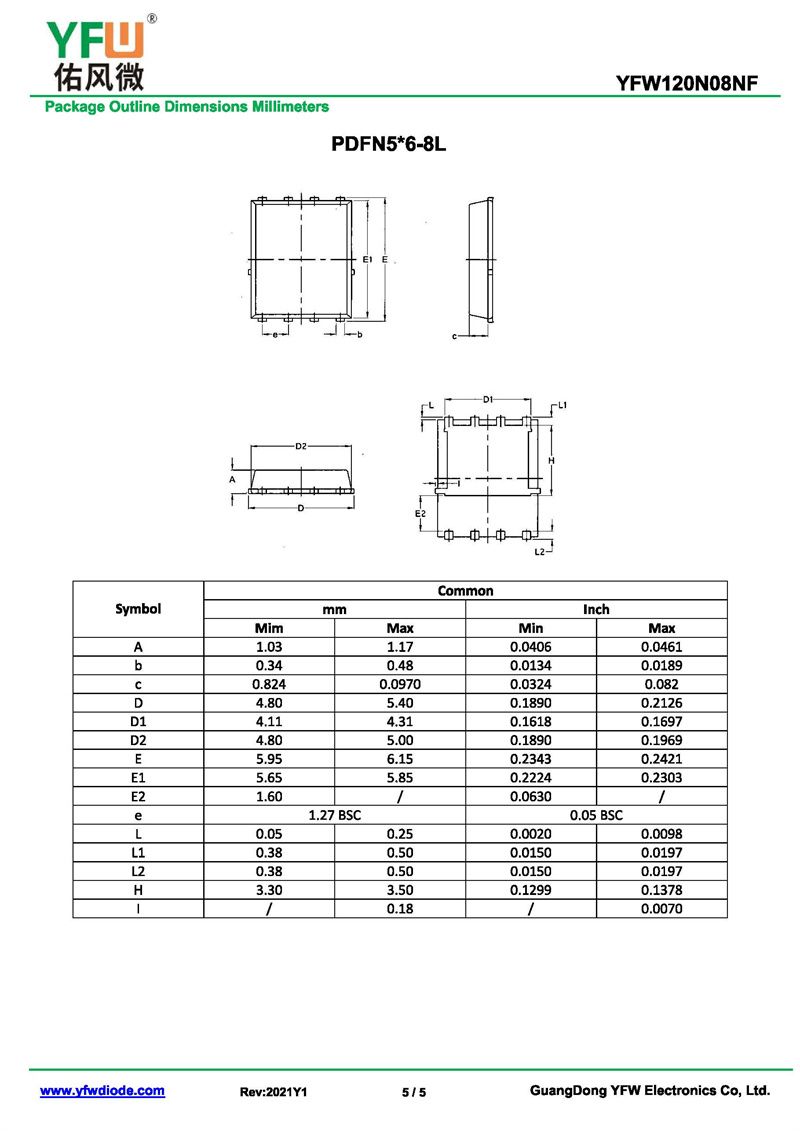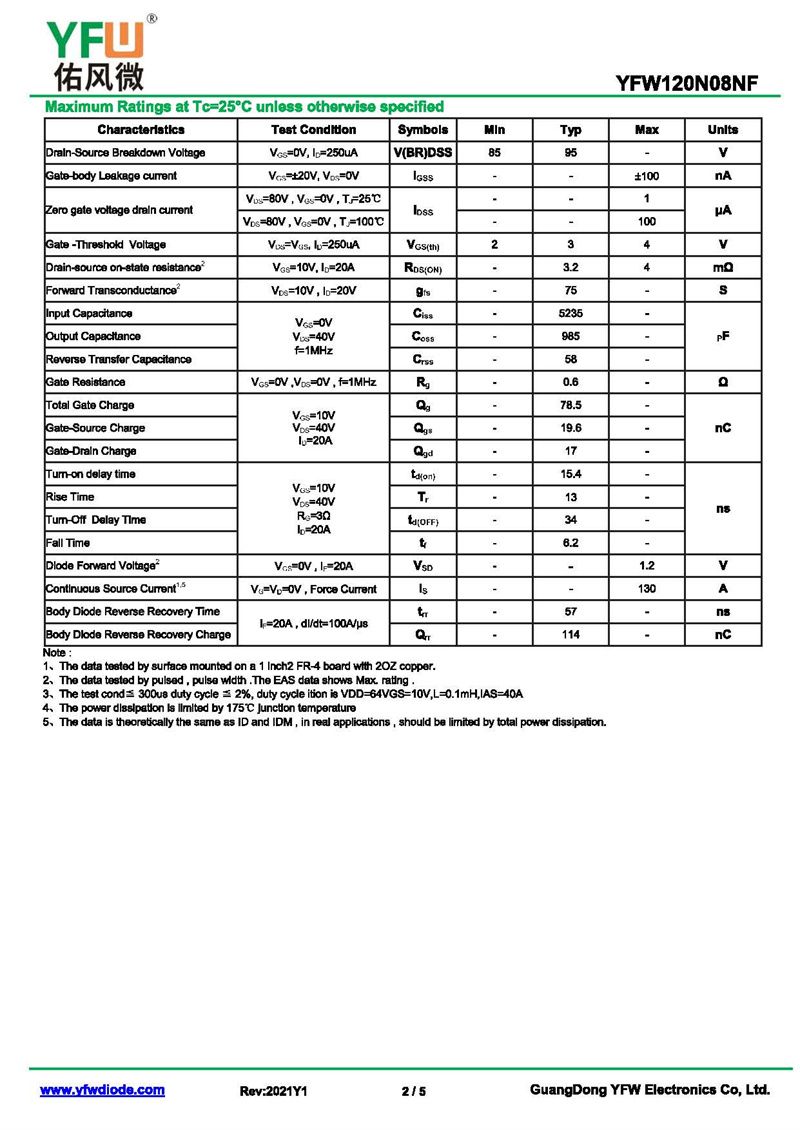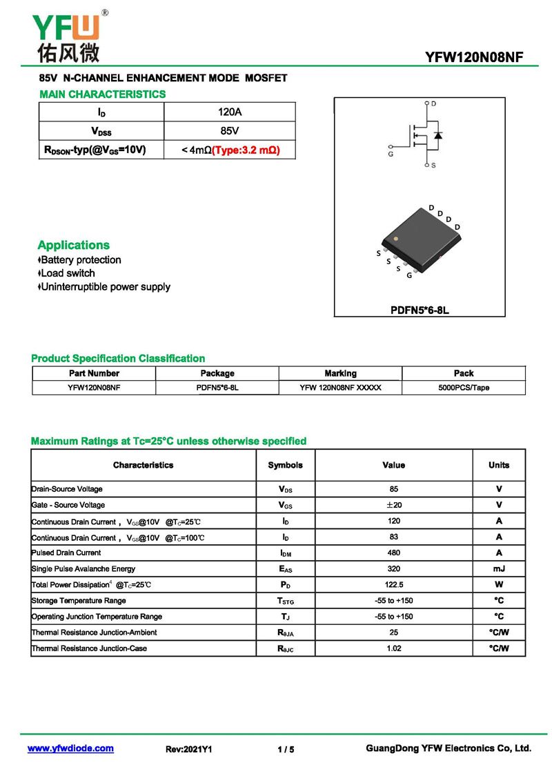 場效應管YFW120N08NF 規格書_價格_PDF手冊-廣東佑風微原廠YFW120N08NF PDFN5*6-8L_(YFW佑風微)品牌