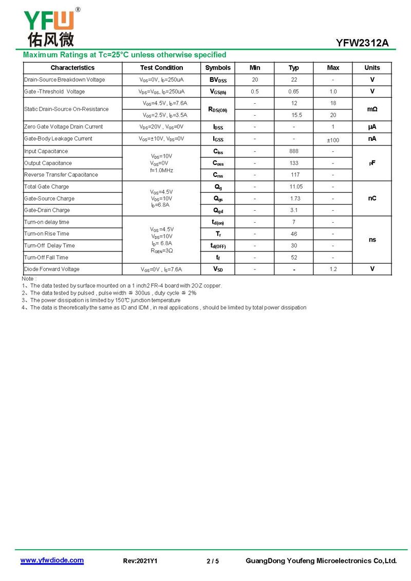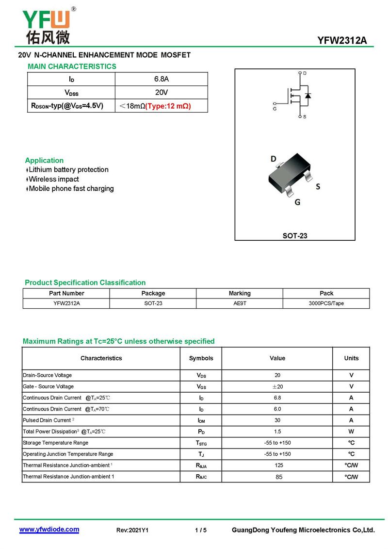 場效應管YFW2312 規格書_價格_PDF手冊-廣東佑風微原廠YFW2312 SOT-23 _(YFW佑風微)品牌