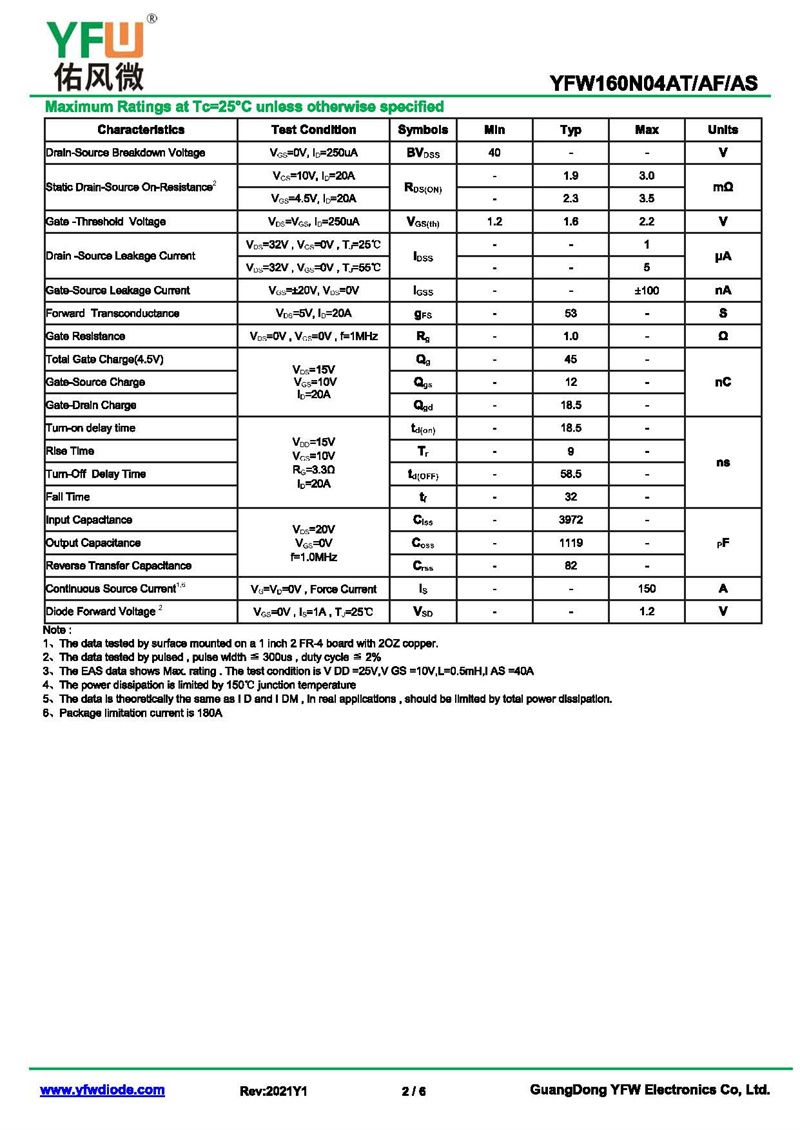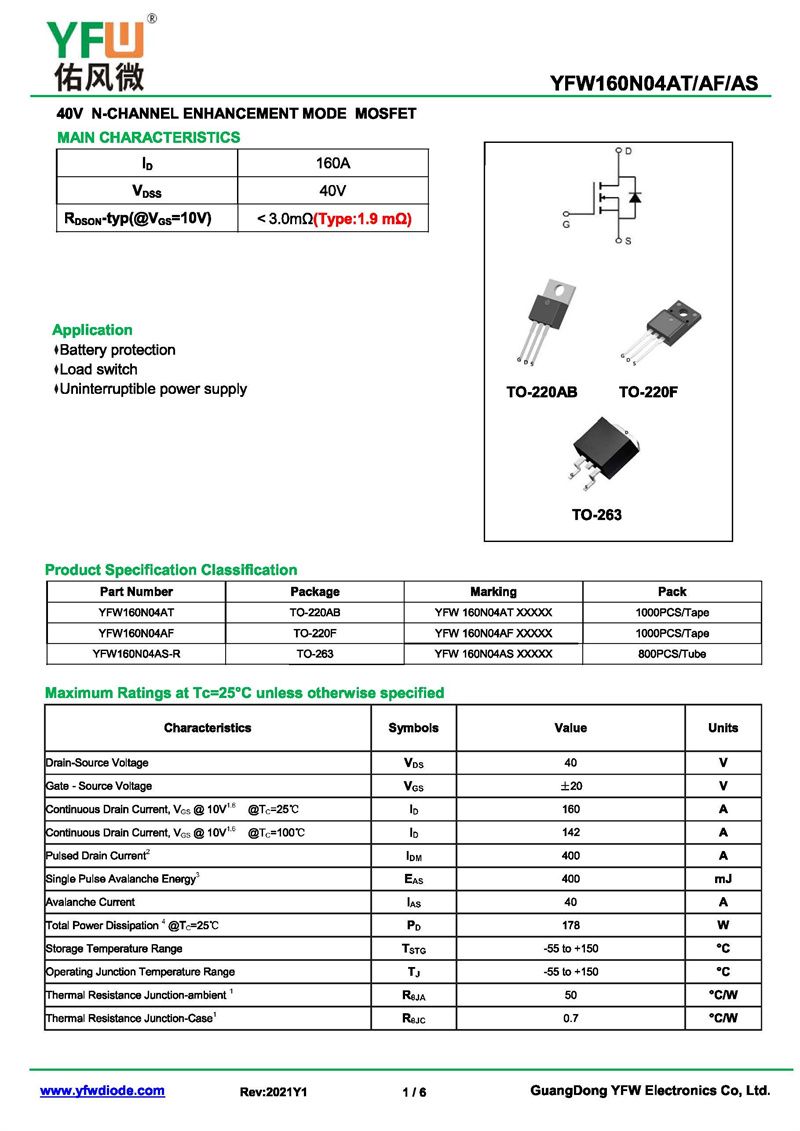 場效應管YFW160N04AT 規(guī)格書_價格_PDF手冊-廣東佑風微原廠YFW160N04AT TO-220AB _(YFW佑風微)品牌