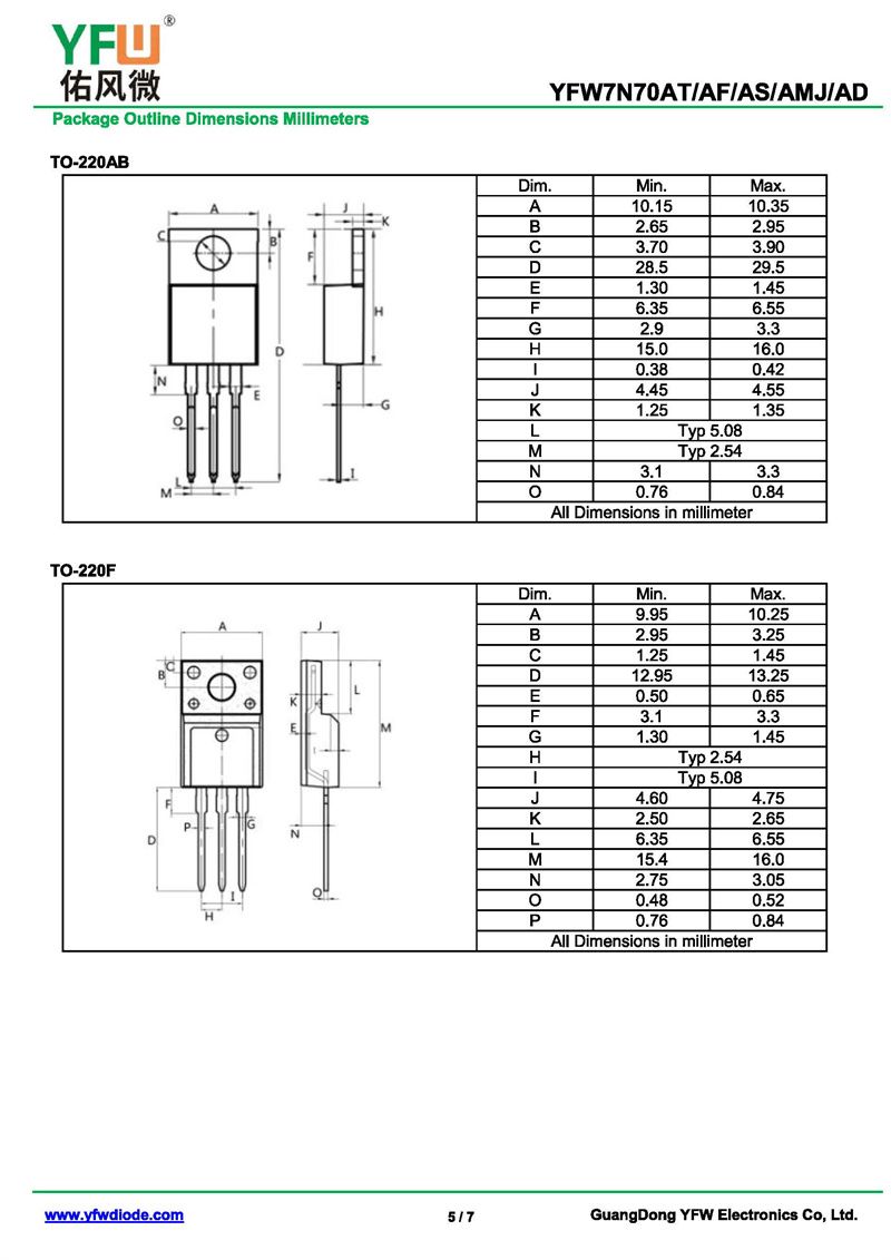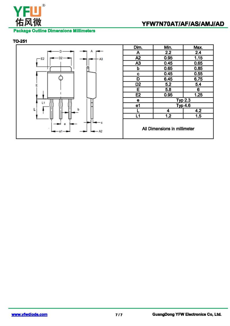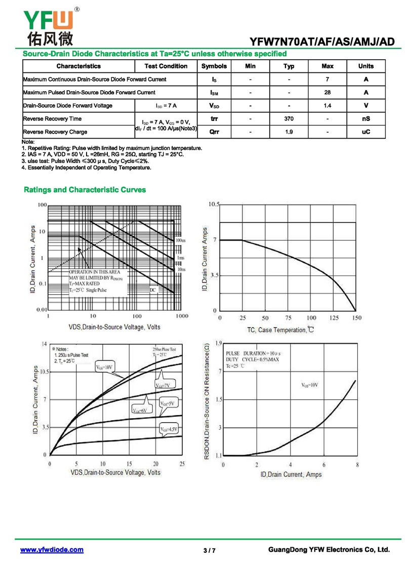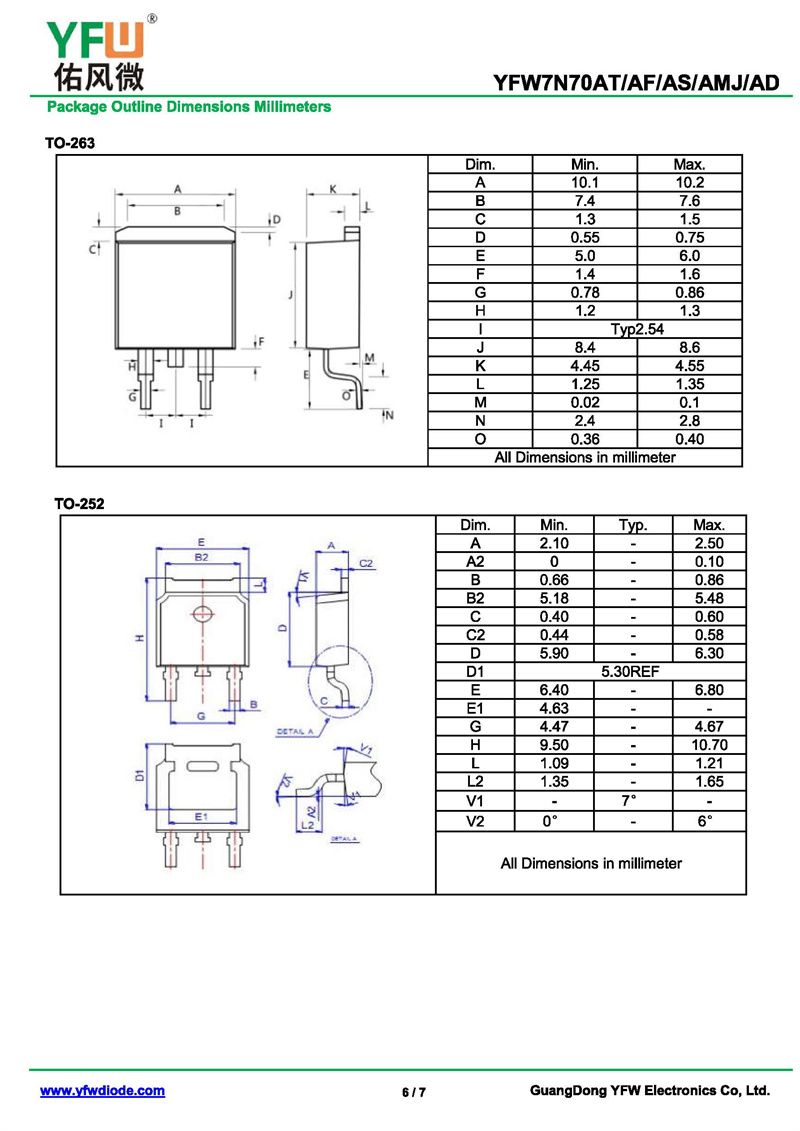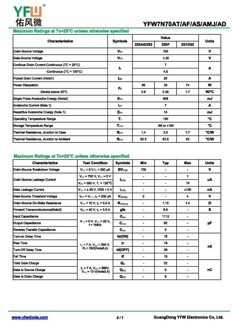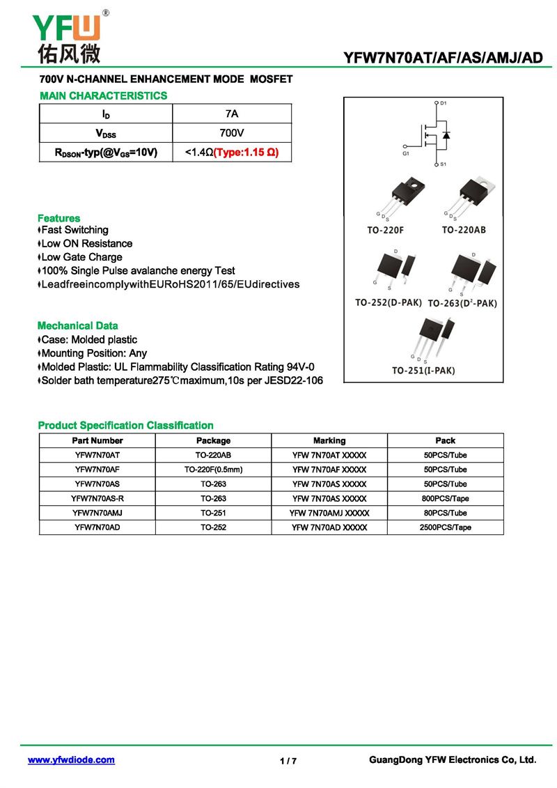 場效應管YFW7N70AD 規格書_價格_PDF手冊-廣東佑風微原廠YFW7N70AD TO-252_(YFW佑風微)品牌
