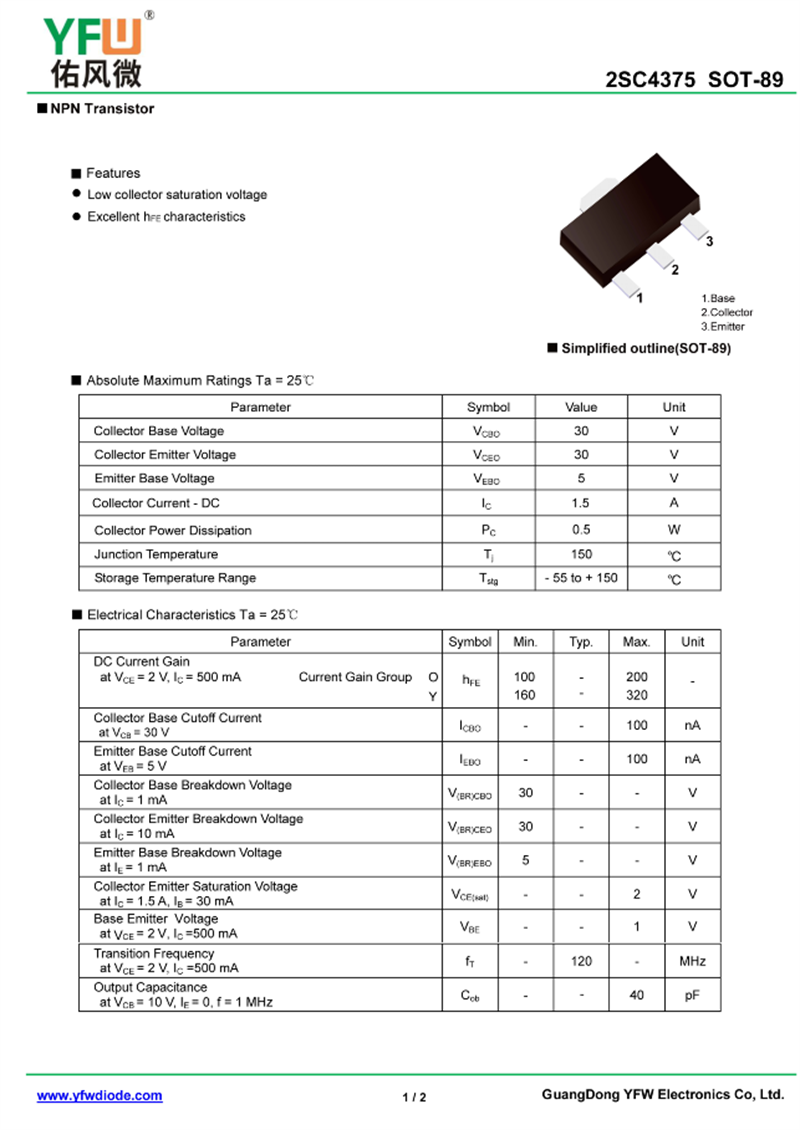 晶體管2SC4375 規格書_價格_PDF手冊-廣東佑風微原廠2SC4375 SOT-89_(YFW佑風微)品牌