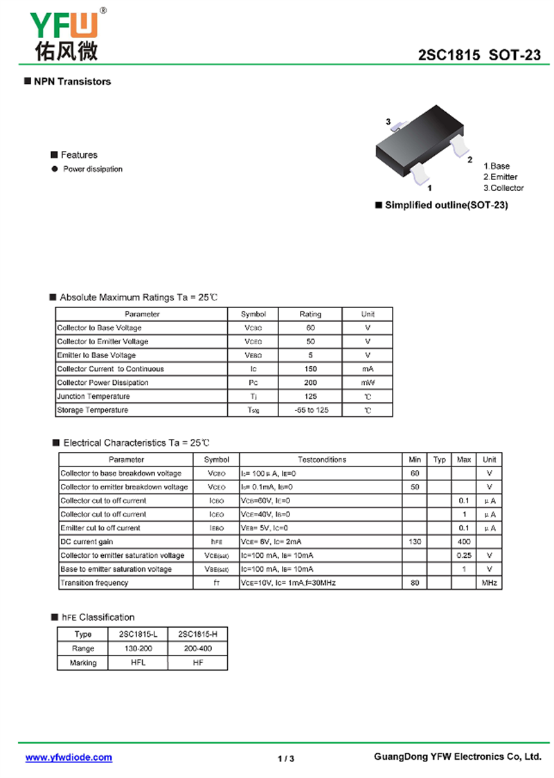 晶體管2SC1815 規(guī)格書_價(jià)格_PDF手冊(cè)-廣東佑風(fēng)微原廠2SC1815 SOT-23_(YFW佑風(fēng)微)品牌