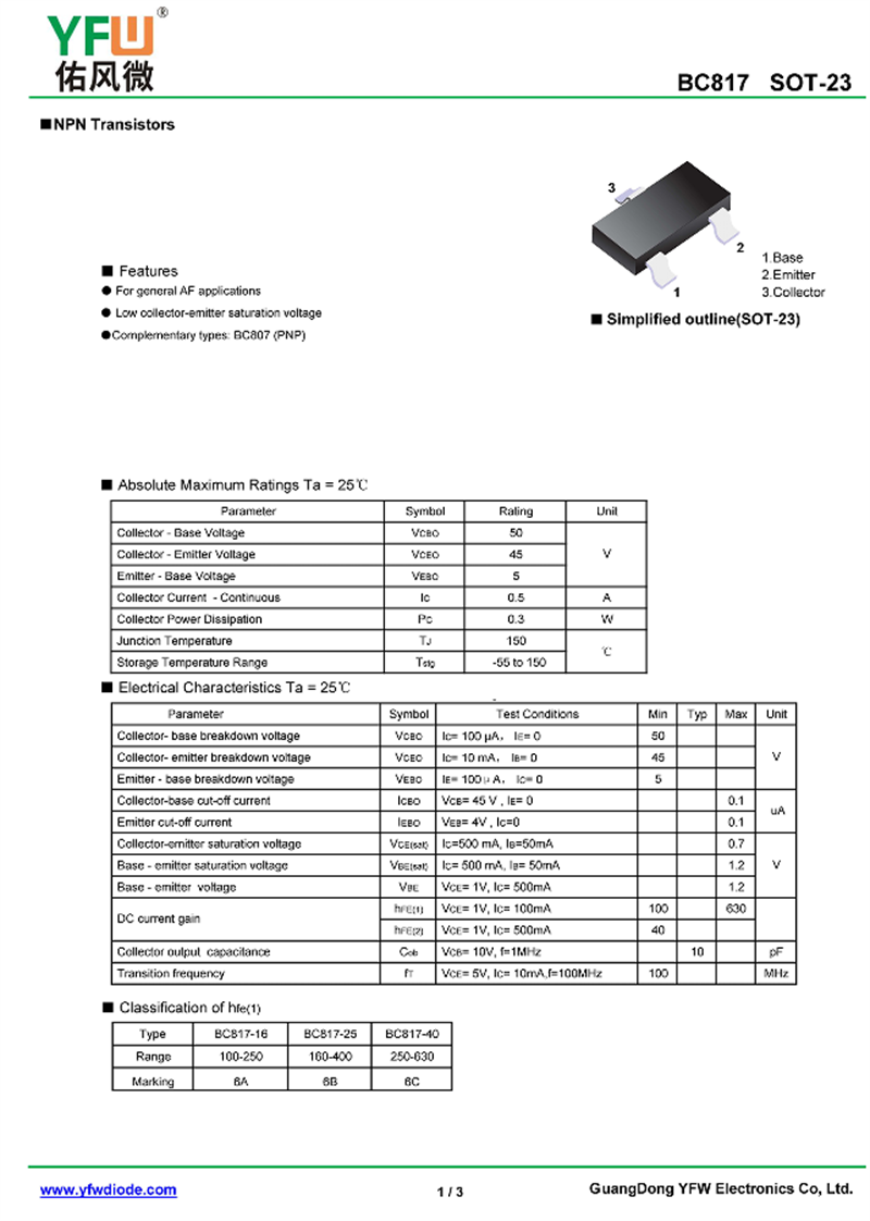 晶體管BC807 規(guī)格書_價(jià)格_PDF手冊-廣東佑風(fēng)微原廠BC807 SOT-23_(YFW佑風(fēng)微)品牌