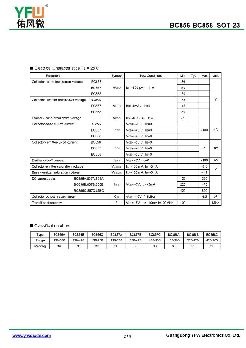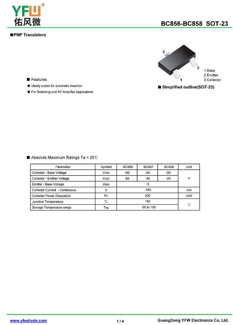 晶體管BC856 規格書_價格_PDF手冊-廣東佑風微原廠BC856 SOT-23_(YFW佑風微)品牌