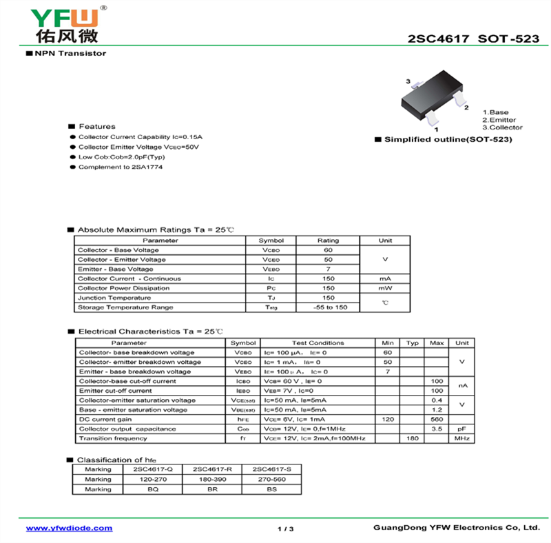 晶體管2SC4617 規(guī)格書_價格_PDF手冊-廣東佑風微原廠2SC4617 SOT-523_(YFW佑風微)品牌