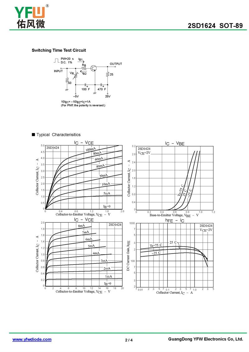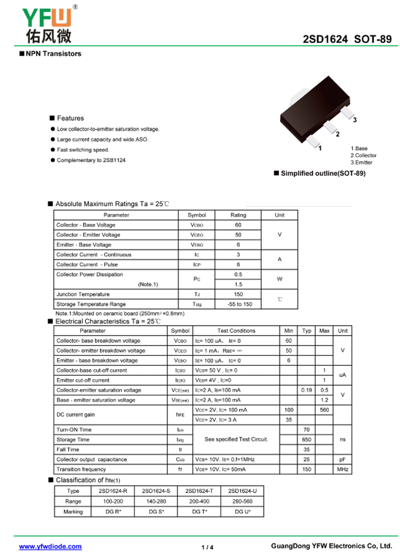 晶體管2SD1624 規格書_價格_PDF手冊-廣東佑風微原廠2SD1624 SOT-89_(YFW佑風微)品牌