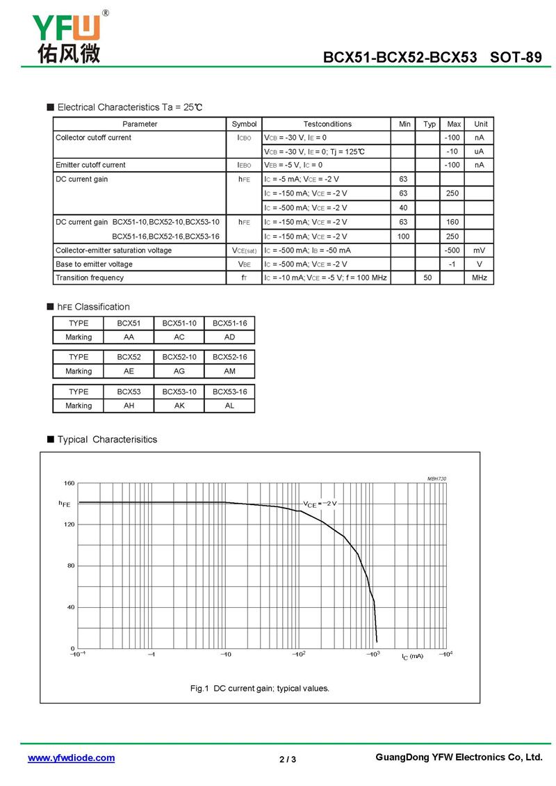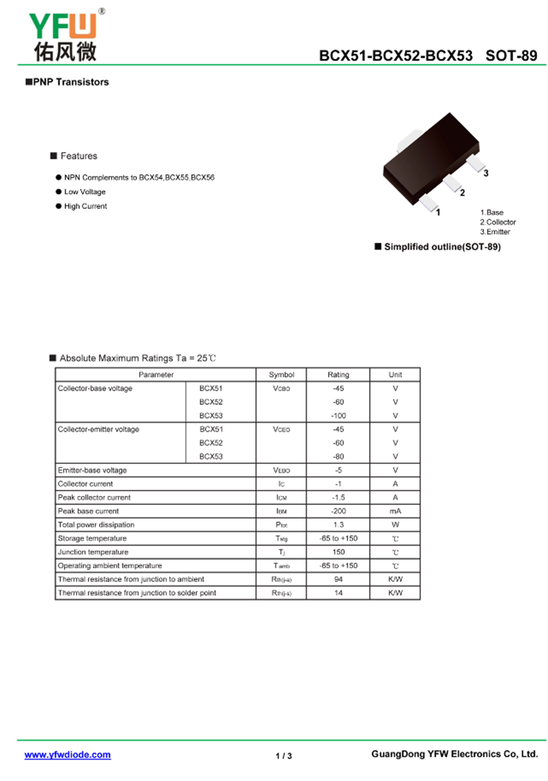 晶體管BCX52 規格書_價格_PDF手冊-廣東佑風微原廠BCX52 SOT-89_(YFW佑風微)品牌