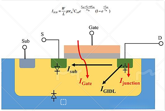在實際應用中,MOS管常常存在各種漏電流,這使得它嚴重減少了低功耗設備電池的使用壽命,以及在一些s&h電路中,限制了信號保持時間。而一個理想的MOS管是不應該存在任何電流流入襯底的,特別是當MOS管關斷時,漏-源極之間不應該存在任何電流。