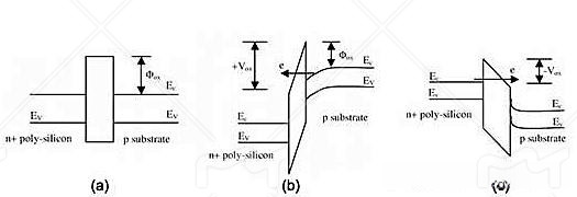 當柵極端子正偏置時,能帶圖會發生變化,如圖(b)。強烈反轉表面處的電子隧道進入或穿過 SiO 2層,從而產生柵極電流。
